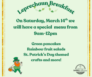 Join us for green pancakes, fruit salads, delicious breakfast foods, crafts and more! We will be ready to celebrate with you on Saturday March 14th from 9am-12pm.