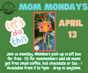 Join us for a butterfly craft on Mom Monday this April 13 – Barrel & Baskit members will get a craft box for free and non-members will pay $5 for their craft box. Free coffee or hot chocolate or tea for all moms.